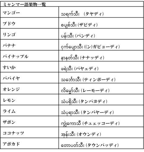 こんにちは、テイリ。ちょっと聞きたいことがあるんだけどいいかな? こんにちは、ノリ。大丈夫だよ。どうしたの? ありがとう。ミャンマーに来て少し落ち着いたから、市場で果物を買いに行こうかと思っているんだけど、色々な果物をミャンマー語でどういう…